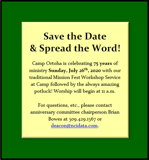 We have so much to celebrate! Please mark your calendars and join us at Camp for Mission Fest Sunday next summer. We are aiming for a huge 75-year reunion for anyone who was a camper, speaker, cook, art director, camp director, parent or involved in anyway with Camp Ortoha during the past 75 years. Right now we need you to spread the word to your kids, grandkids, friends who attended camp with you, siblings, cousins, nephews, nieces, other churches and anywhere you know there might be folks who attended camp from 1945 onward.